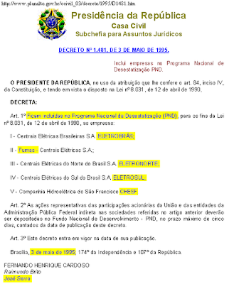 Felizmente o processo de privatização fracassou, mas José Serra (PSDB) bem que tentou, assinando o decreto nº 1481/1995 para levar à leilão até geradoras de energia elétrica, quando era Ministro do Planejamento de Fernando Henrique Cardoso.Por esse decreto, até Itaipu seria privatizada (50% sob controle da Eletrobrás). As centrais nucleares de Angra I e II também ficariam sob controle privado. Tucuruí e as hidelétricas do Rio São Francisco também.